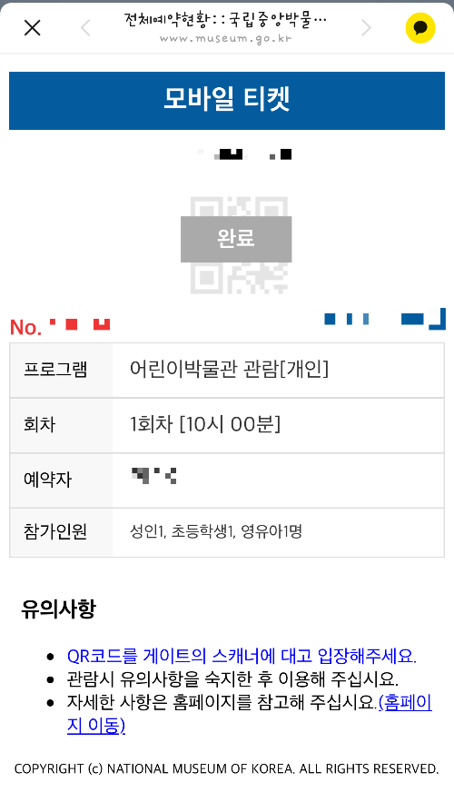 1. 현장 발권은 불가능하며, 어린이박물관 입구에서 모바일 티켓 확인 후 입장하실 수 있습니다.