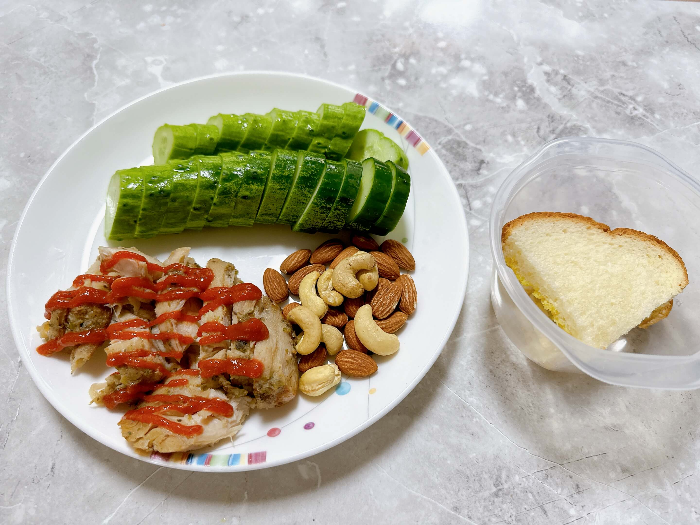 목요일 점심 : 닭가슴살 + 아몬드,캐슈넛 + 오이1개 + (식빵+계란+치즈) 샌드위치 1/2쪽